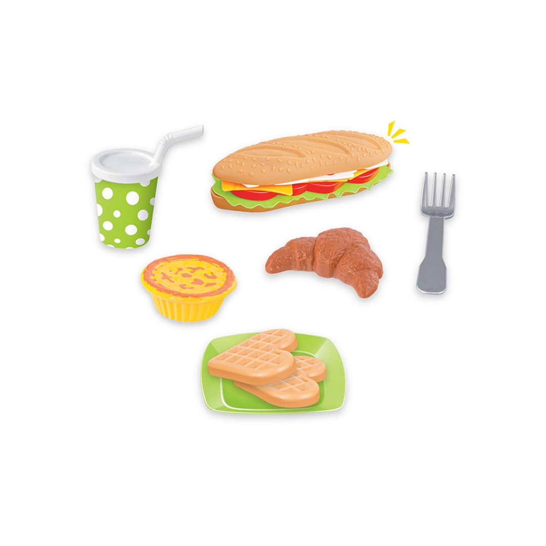 Lekesett med baguette og ingredienser for “sandwich”-lek. Lar barn øve seg på pålegg og servering.