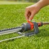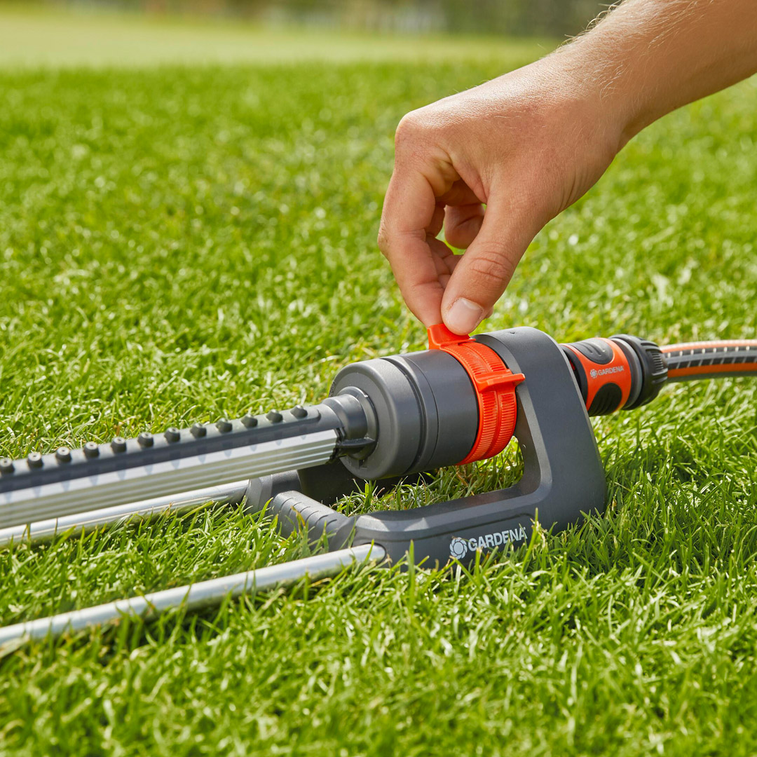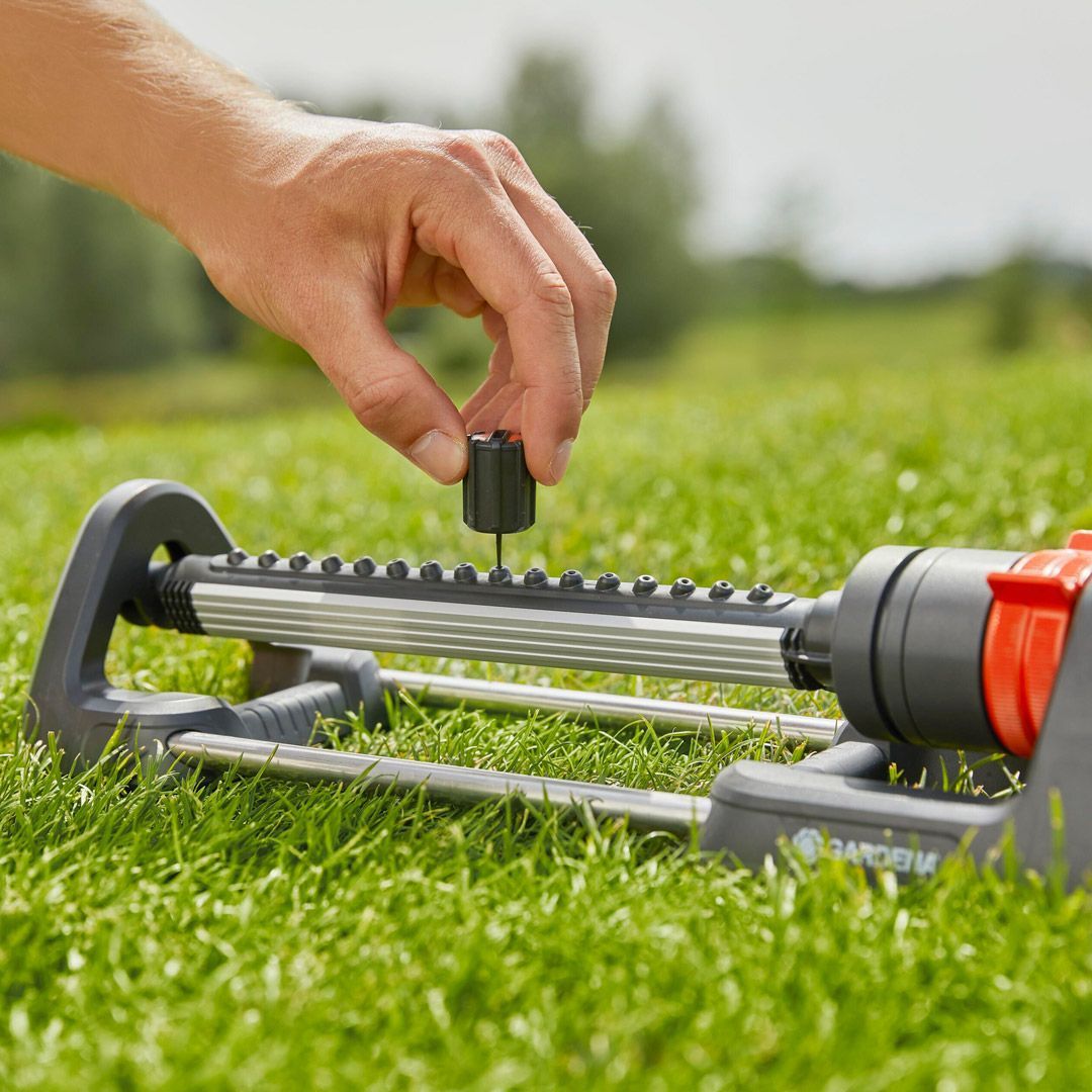 Med Aqua M-sprederen fra Gardena trenger du aldri vente på regn når plenen din trenger vanning. Det er nå opp til deg når plenen din skal vannes. I tillegg er du sikker på at det gjøres pålitelig – og ikke minst – jevnlig, hver gang du vanner, uten at det oppstår små dammer. Nyt hver lille del av sommeren, sprederen er designet for områder mellom 110 og 250 m?. Den er ekstremt enkel å bruke og klar til bruk på et øyeblikk. Når slangen er tilkoblet lar glidebryterne deg stille inn rekkevidden mellom 8 og 18 meter. Bredden er alltid rundt 14 meter, og du kan også stille den til å bare vanne halvparten av plenen. Sprederen har holdbare metalldeler for å sikre at den alltid holder seg stødig på bakken. GARDENA´s Made in Germany vannspreder Aqua M er laget av kvalitetsmaterialer, noe som særlig er dokumentert i disse to bemerkelsesverdige detaljene: først er vannsprederen beskyttet mot UV-stråler og deretter er den frostsikker. Den har også 5 års fabrikkgaranti. Et metallfilter som er plassert i vanntilkoblingen gjør at skitt ikke kommer inn i vannet og det kan tas ut og vaskes og rengjøres under rennende vann. I motsatt ende av sprederen under en skrukork er det en nål som du kan bruke til å punktere dysene i vannet hvis de kalkes.