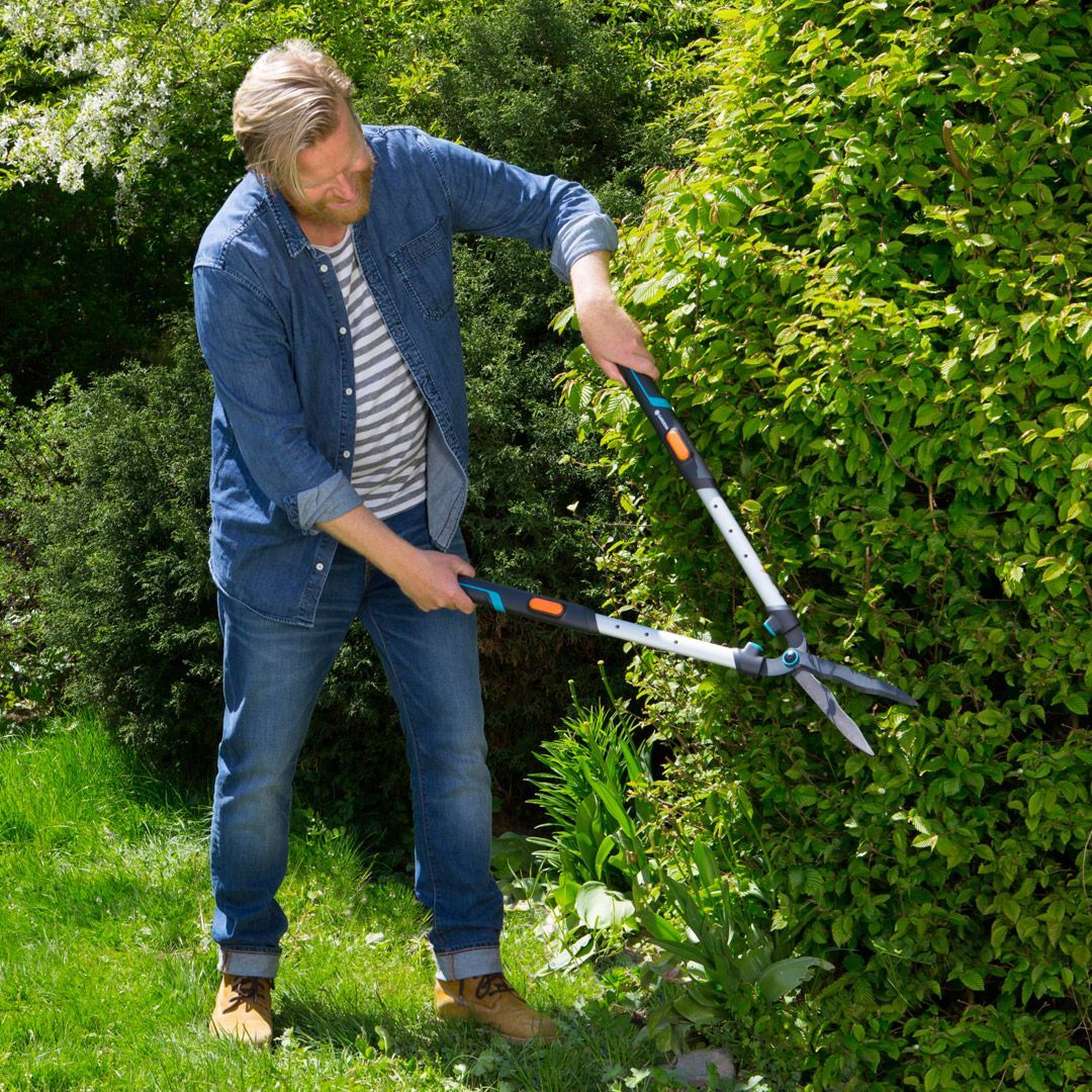 TeleCut hekksaks fra GARDENA imponerer med sine praktiske egenskaper og en garanti på hele 25 år. Takket være det utrekkbare teleskopskaftet på TeleCut kan du øke rekkevidden med opptil 20 cm. Dette kan spare deg for å måtte strekke deg eller hente stigen. Til tross for utvidelsen har du fortsatt full klippestyrke. Bladene har taggete kanter for kutting av større overflater med høy presisjon og effektivitet. Denne slipingen sørger for at blader og kvister ikke glir bort når man klipper. Non-stick belegget sørger for at det ikke fester seg noe til bladet.