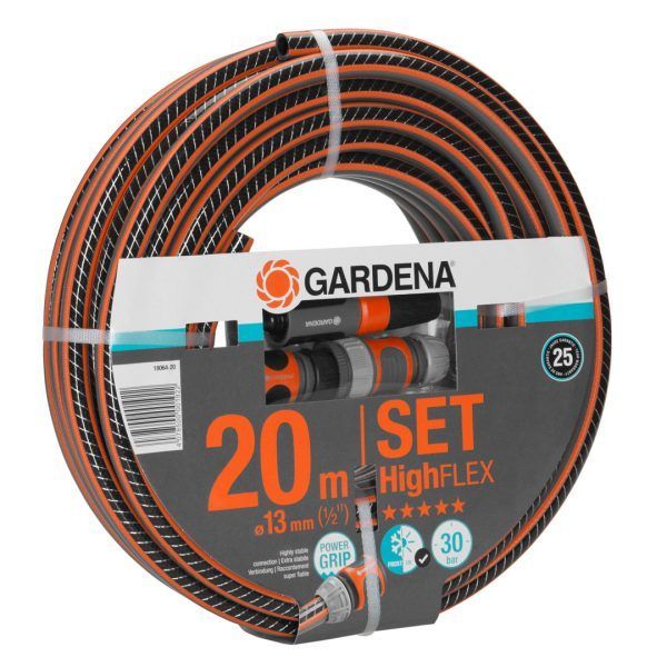 Denne pakken inneholder GARDENA Comfort HighFLEX slange med ulike GARDENA systemkoblinger. Power Grip-profilen sikrer perfekt tilkopling mellom slangen og slangekoplingen. Takket være den tette spiralnettingen av høy kvalitet med to spiraler i motsatt retning av hverandre, er slangen trykkbestandig og beholder fasongen, samtidig som den er mer fleksibel i bruk enn Comfort FLEX-slangen. Dette skyldes økt tetthet i spiralene, som gjør slangen mer fleksibel og lettere å håndtere. Den floker eller vrir seg ikke, er fri for skadelige plaststoffer (ftalater) og tungmetaller og naturligvis UV-bestandig. Hele settet inneholder følgende produkter: 1 gjenget krankopling, 1 adapter, 1 standard slangekopling, 1 vannstopper og 1 sprøytemunnstykke.