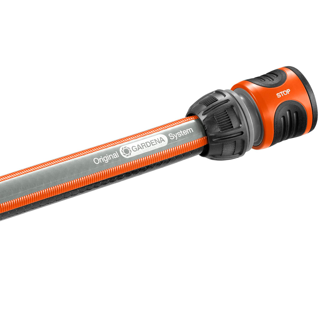 GARDENA vannstopper er koblet til slangeutløpet. Når et tilb ehør blirkoblet fra, f. eks. et munnstykke eller en spreder, stoppes vannet automatisknår et tilbehør kobles til, strø mmer vannet fritt igjen. Dette sparerdeg for en tur til kra nen når du skifter tilbehør. POWER GRIP: Spesieltutformet m uffe-mutter for en svært stram passform og problemfri montering. Takket være det riflede, myke plasthåndtaket, ligger GA RDENA slangetilkgodt og sikkert i hånden. Slangetilko blingen er beskyttet med en gummiringsom forhindre skade.