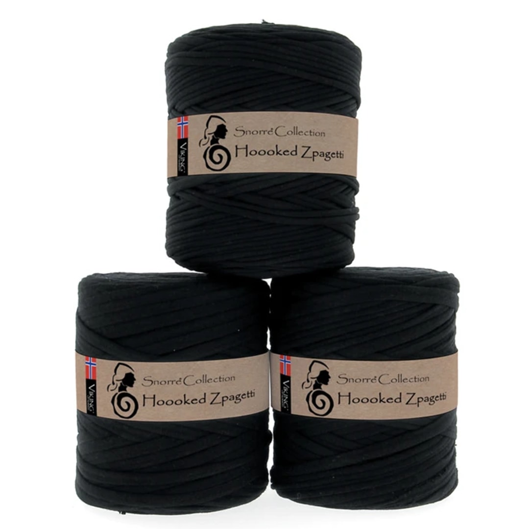 Viking Garn Snorre Hoooked Zpagetti 703 svart er et tykt og elastisk t-skjortegarn laget av resirkulerte tekstiler. Garnet bestür av resirkulert bomull og andre resirkulerte fibre, produsert av overskuddstøy fra europeisk t-skjorteproduksjon. Hvert nøste er unikt, og nyanser kan variere innen samme farge. Garnet egner seg godt til hekling av vesker, interiørartikler og større prosjekter som puter, puffer og tepper.