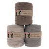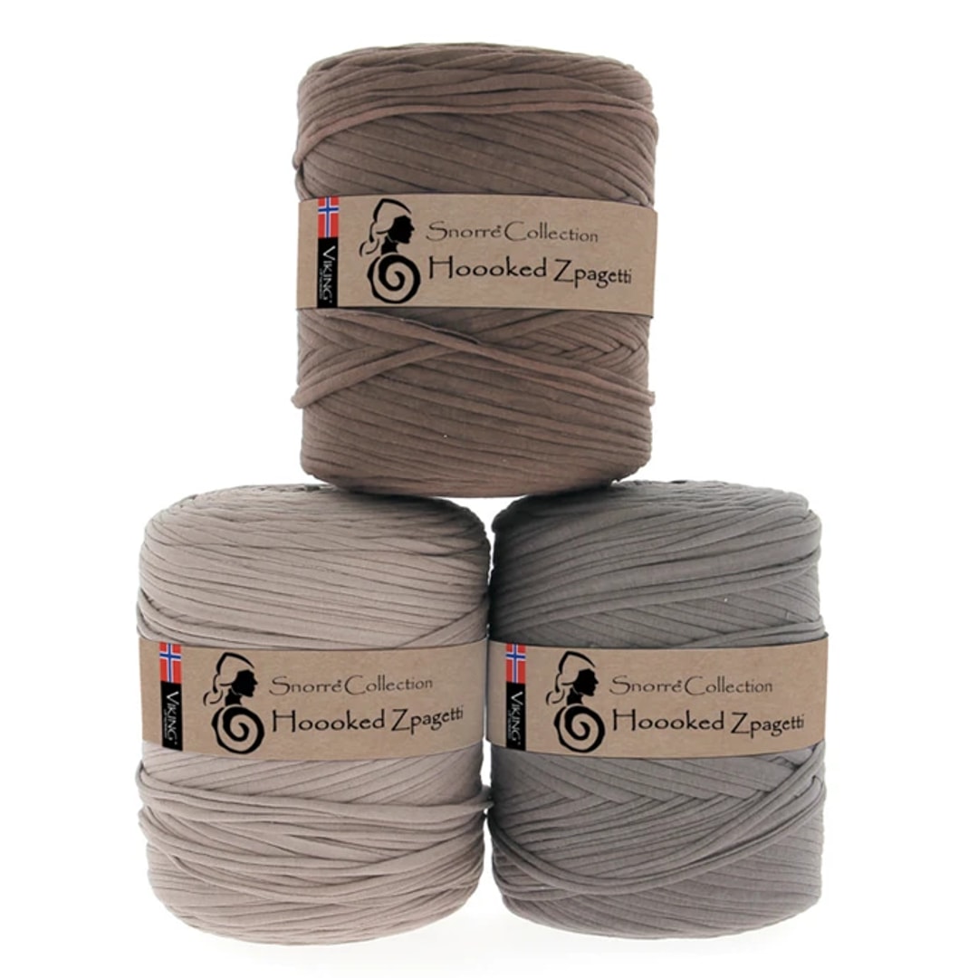 Viking Garn Snorre Hoooked Zpagetti 709 lys brun er et tykt og elastisk t-skjortegarn laget av resirkulerte tekstiler. Garnet bestür av resirkulert bomull og andre resirkulerte fibre, produsert av overskuddstøy fra europeisk t-skjorteproduksjon. Hvert nøste er unikt, og nyanser kan variere innen samme farge. Garnet egner seg godt til hekling av vesker, interiørartikler og større prosjekter som puter, puffer og tepper.
