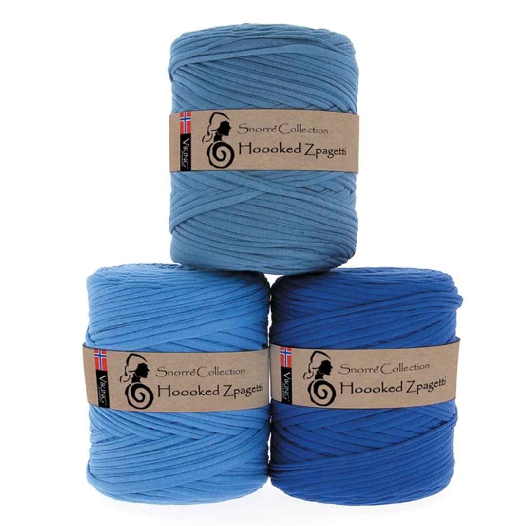 Viking Garn Snorre Hoooked Zpagetti 723 mellomblü er et tykt og elastisk t-skjortegarn laget av resirkulerte tekstiler. Garnet bestür av resirkulert bomull og andre resirkulerte fibre, produsert av overskuddstøy fra europeisk t-skjorteproduksjon. Hvert nøste er unikt, og nyanser kan variere innen samme farge. Garnet egner seg godt til hekling av vesker, interiørartikler og større prosjekter som puter, puffer og tepper.