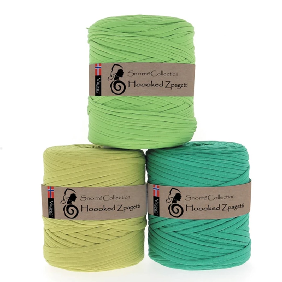 Viking Garn Snorre Hoooked Zpagetti 732 grønn er et tykt og elastisk t-skjortegarn laget av resirkulerte tekstiler. Garnet bestür av resirkulert bomull og andre resirkulerte fibre, produsert av overskuddstøy fra europeisk t-skjorteproduksjon. Hvert nøste er unikt, og nyanser kan variere innen samme farge. Garnet egner seg godt til hekling av vesker, interiørartikler og større prosjekter som puter, puffer og tepper.