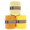 Viking Garn Snorre Hoooked Zpagetti 745 gul er et tykt og elastisk t-skjortegarn laget av resirkulerte tekstiler. Garnet bestür av resirkulert bomull og andre resirkulerte fibre, produsert av overskuddstøy fra europeisk t-skjorteproduksjon. Hvert nøste er unikt, og nyanser kan variere innen samme farge. Garnet egner seg godt til hekling av vesker, interiørartikler og større prosjekter som puter, puffer og tepper.