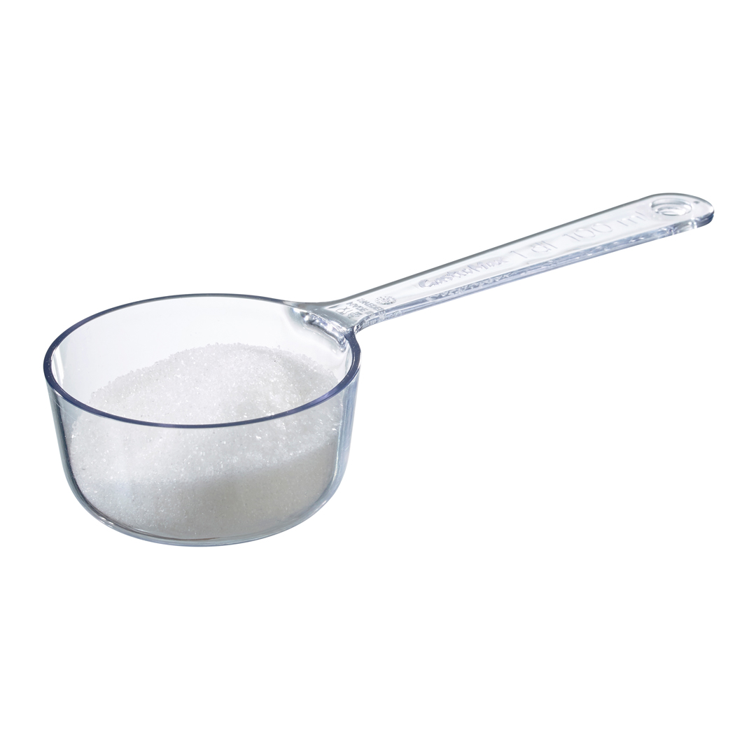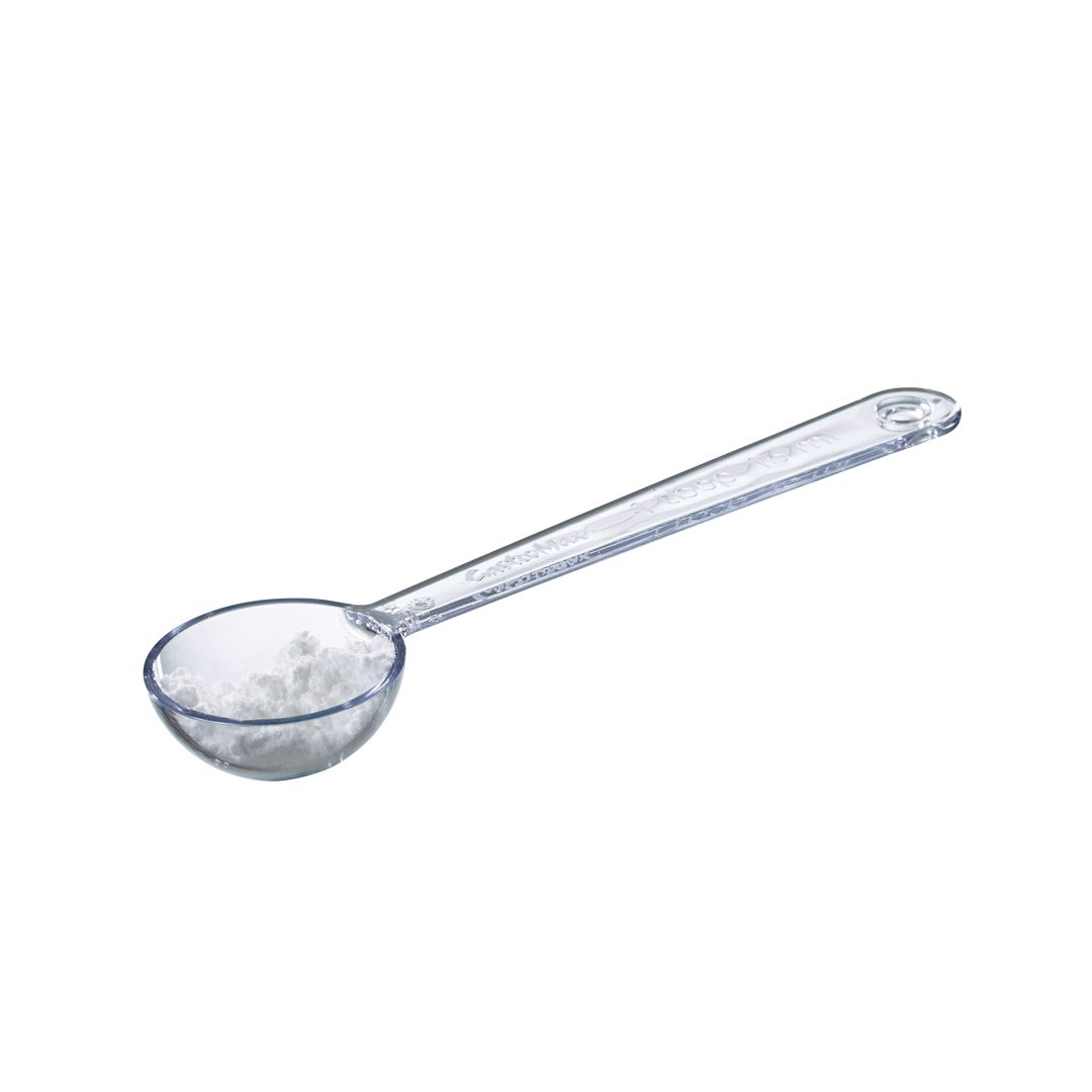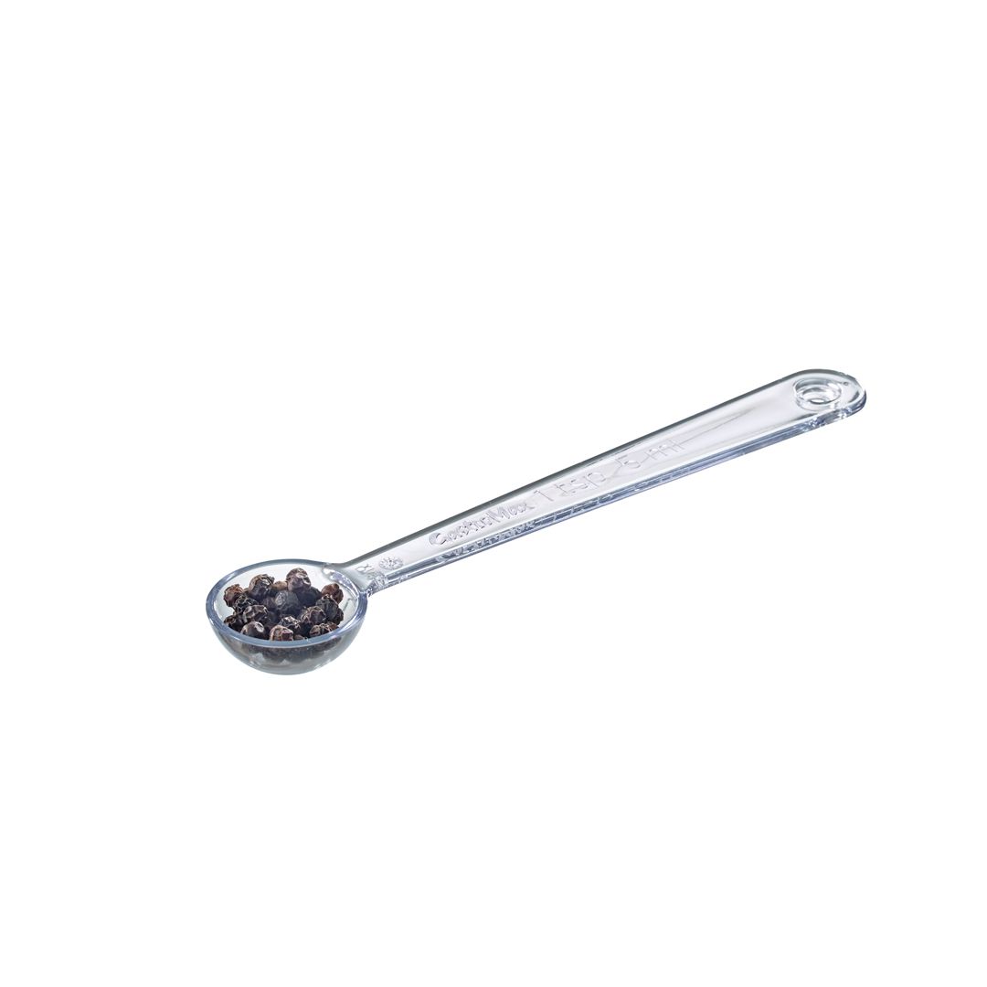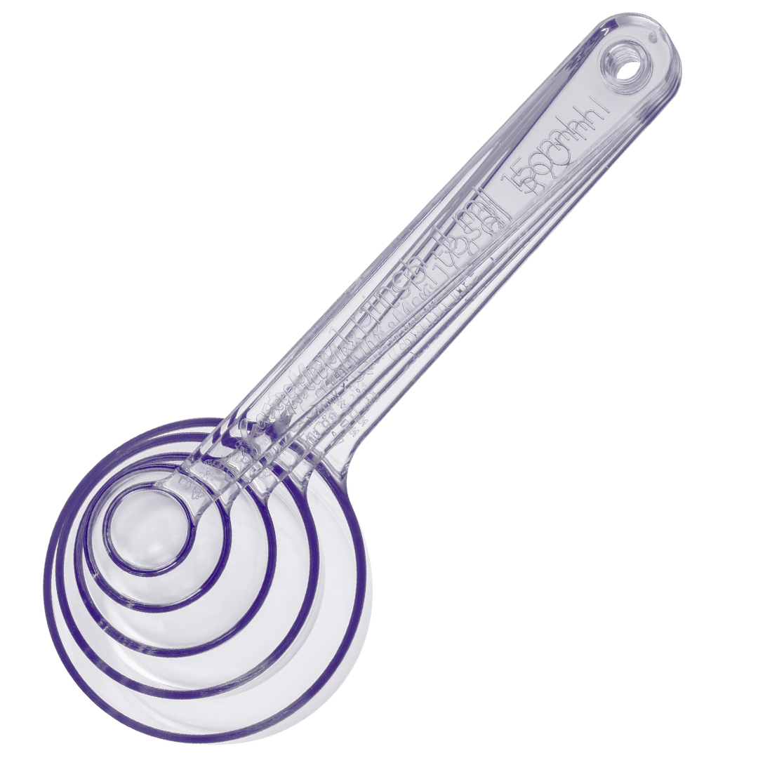 Sett med fem skjeer: kryddermål (1 ml), teskje (5 ml), spiseskje (15 ml), ½ desiliter (50 ml) og 1 desiliter (100 ml). Lange håndtak for lett å skaffe fra høye krukker. Skjeene klikker sammen for kompakt oppbevaring og kan enkelt tas fra hverandre for bruk.