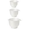 Skåler med helletut for å redusere søl og håndtak for bedre grep. Settet inneholder tre blandeskåler som passer i hverandre for kompakt oppbevaring, i størrelsene 1,5, 2,0, og 3,0 Liter.