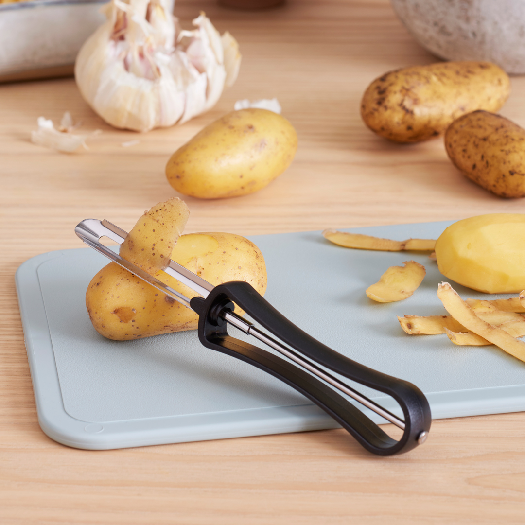 Potetskreller med løst blad som følger konturene på frukt og grønnsakene. Ergonomisk plast håndtak.