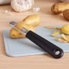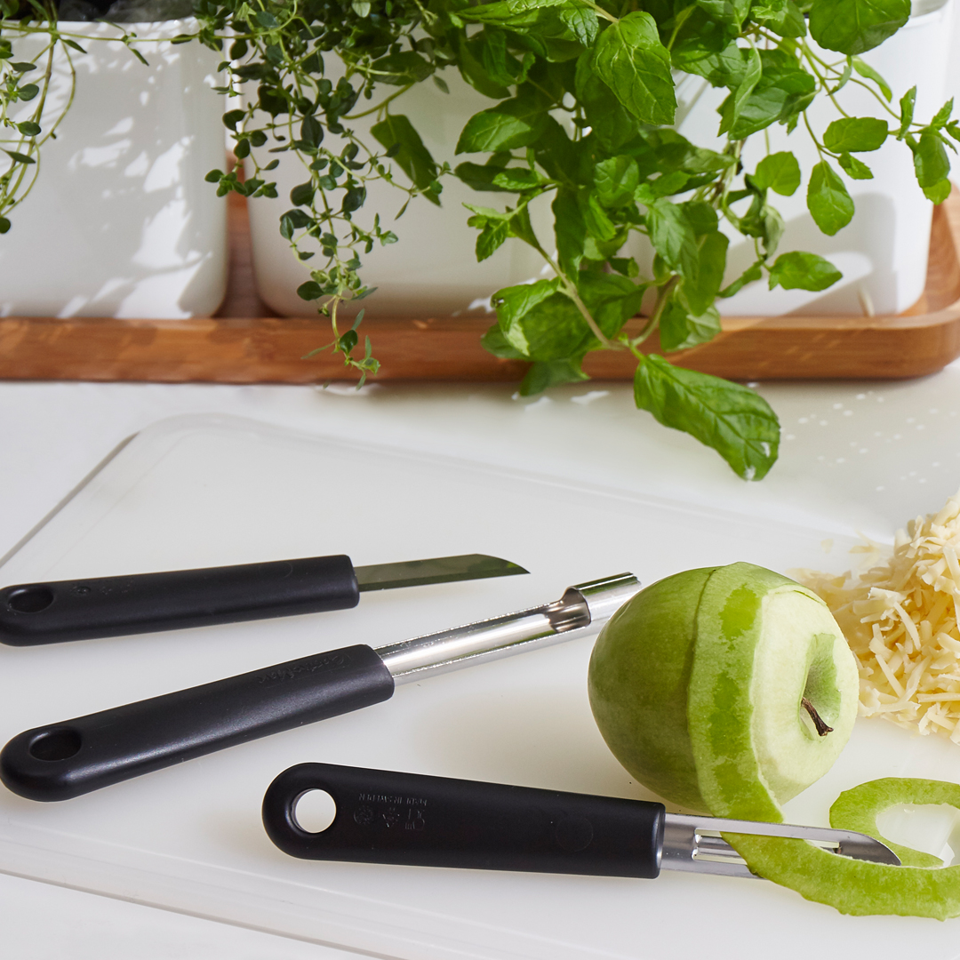 Grønnsakskreller i rustfritt stål med håndtak i plast.