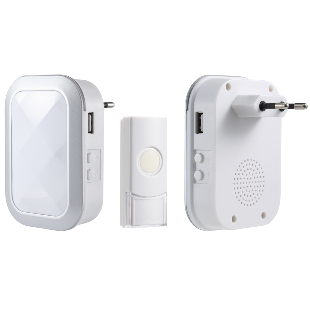 Trådløs dørklokke 230 Volt plugginn. Velg mellom lyd eller lys, eller lyd og lys.