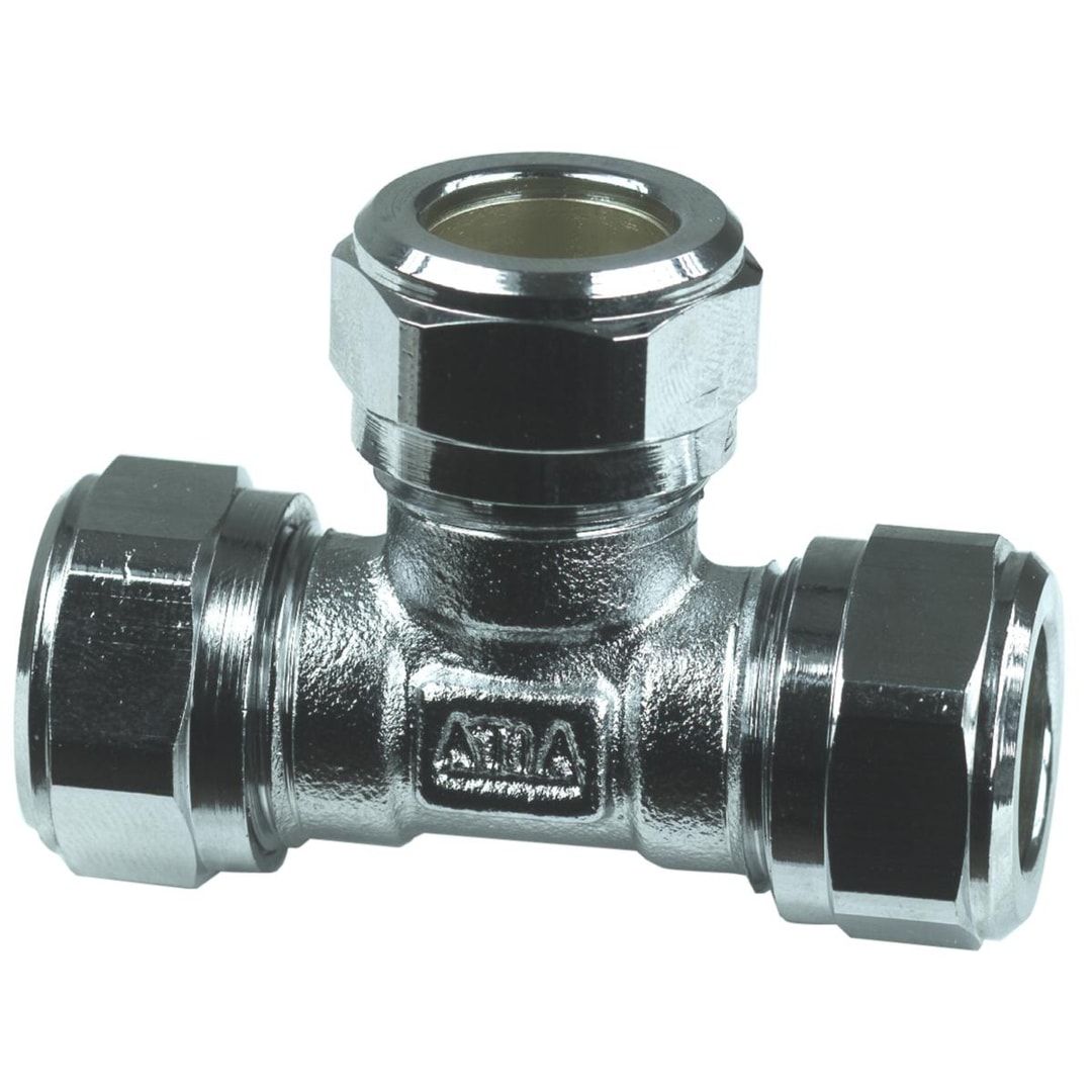 T-rør for klemringskoblinger til kobberrør, inkludert støttehylse. T-stykket er laget i messing med forkrommet overflatebeskyttelse og er beregnet for forgrening i rørinstallasjoner.