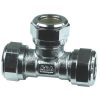 T-rør for klemringskoblinger til kobberrør, inkludert støttehylse. Utført i messing med forkrommet overflatebeskyttelse og brukes for å lage en T-forgrening i røranlegget.