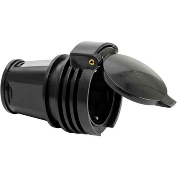 Sort jordet skjøtekontakt i gummi med lokk.