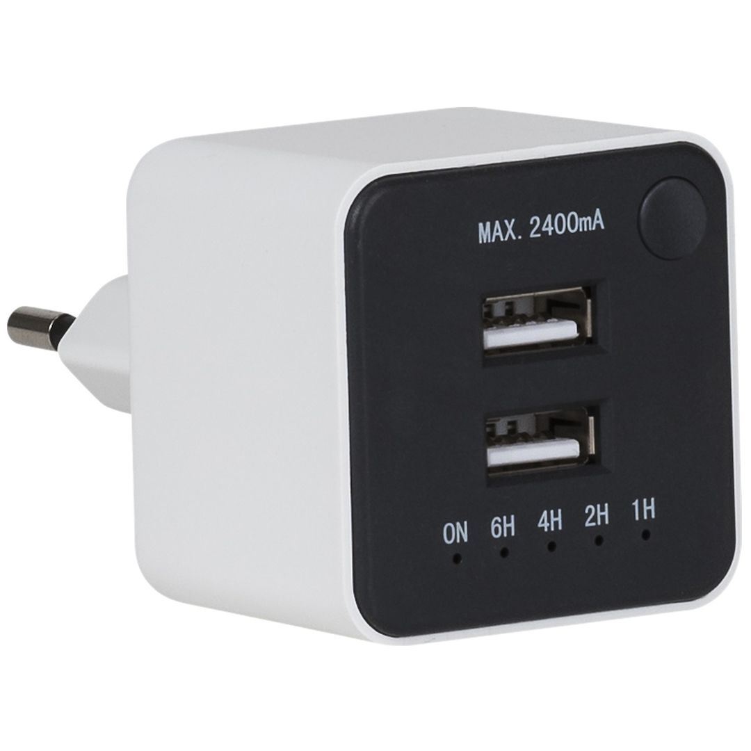Lader med 2 stk USB-uttak. Innebygd nedtellingstimer gjør at du ikke lader mobilen hele natten. Slås på manuelt. Timeren styrer avstegning per automatikk ved valgt antall timer (6, 4, 2 eller 1 time). Blå lysdiode viser hver nedtellingsperiode. Maks 2,4 A når 2 USB-porter brukes samtidig.