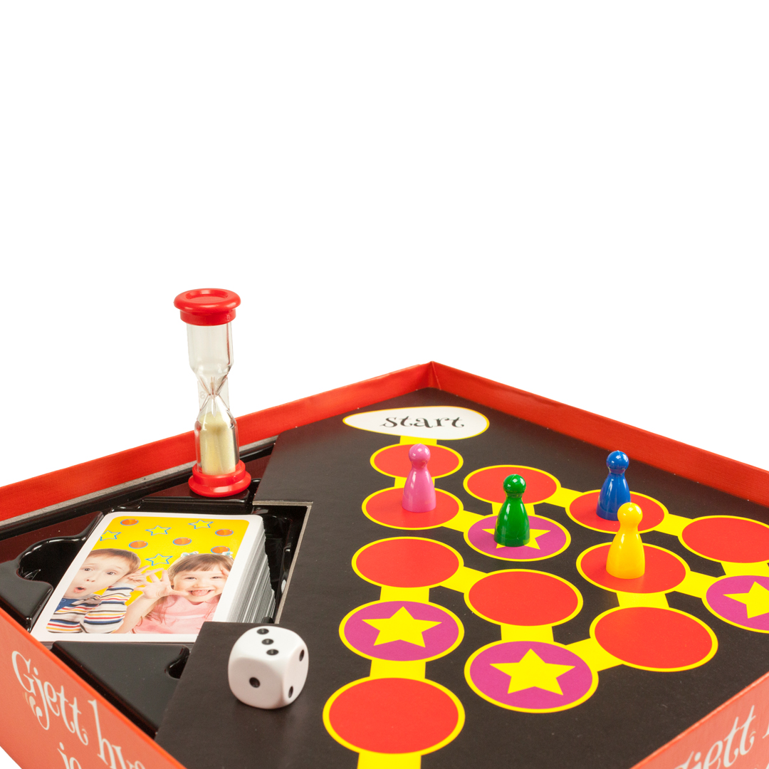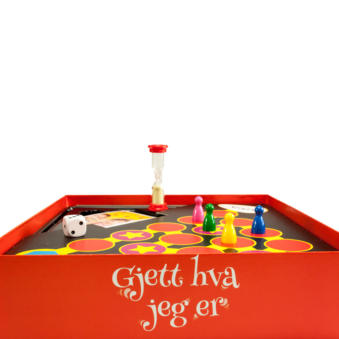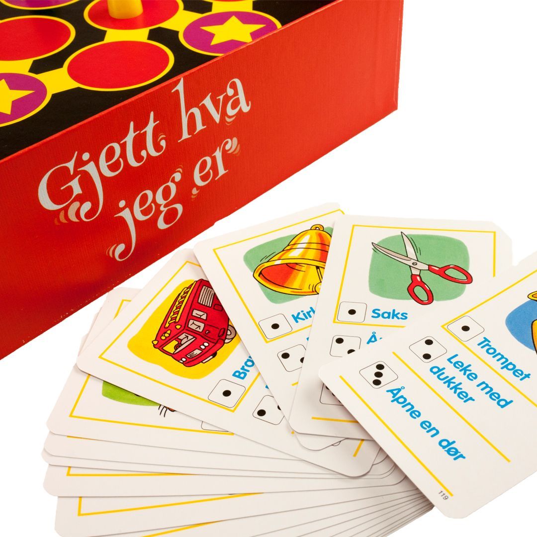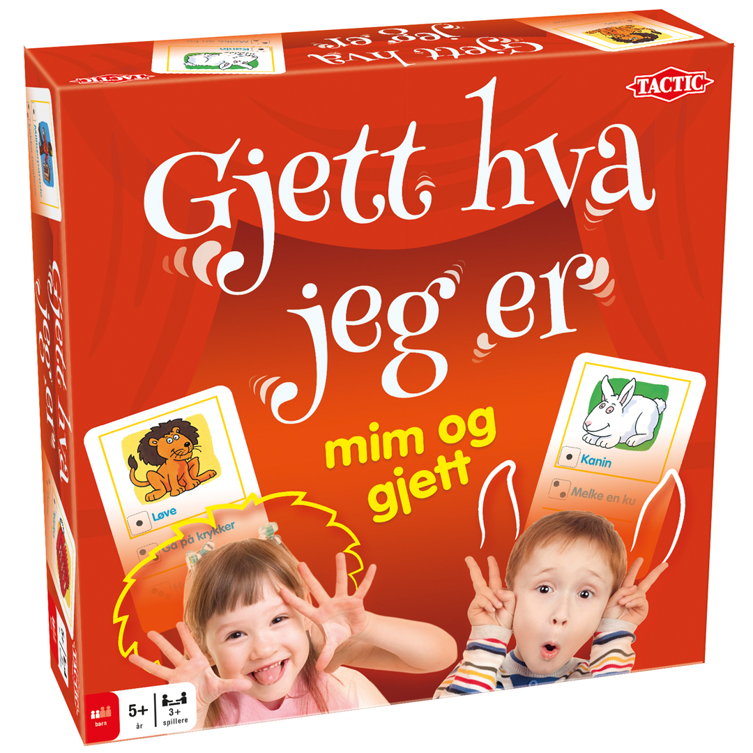 Gjett hva jeg er er et morsomt mimespill for hele familien. Ordene som skal mimes passer for barn fra 5 år og oppover. De aller minste som ikke kan lese, kan se på bildekortene.
