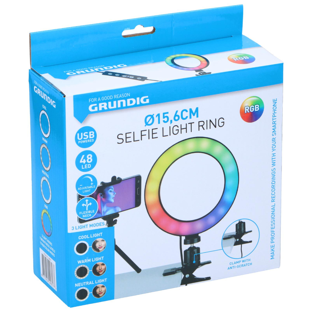 Grundig klipsmontert RGB-ringlys er en kompakt belysningsløsning for foto, video og streaming. Ringlyset festes enkelt med klips og gir fleksibel belysning med kjølig, varm og nøytral lysmodus samt RGB-farger. USB-drevet drift gjør det enkelt å bruke lyset sammen med ulike enheter hjemme eller på farten.
