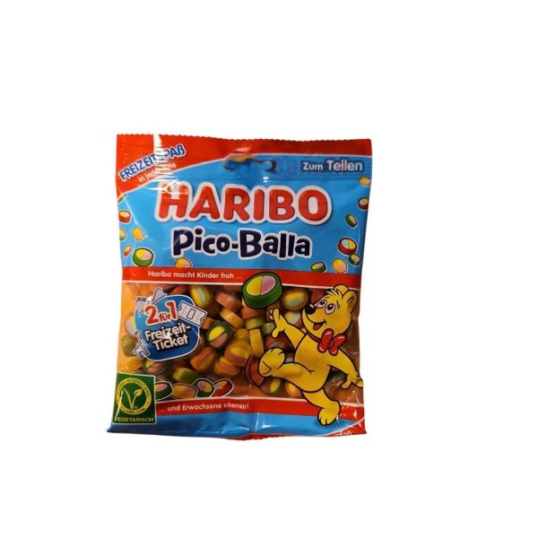 Haribo Pico-Balla er en fargerik blanding av fruktgummi og lakris, med smaker som eple, bjørnebær, jordbær, appelsin, skogsbær og sitron. Denne posen inneholder 160 g og har best før-dato i desember 2024.