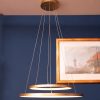 Hatillo LED taklampe i messing med justerbare ringer. Diameter: 60 og 40 cm. Høyde: Justerbar, opptil 150 cm. Materiale: Metall. Lyskilde: LED (SMD) 40W 1000lm 2700K RA90. Lysregulering: 3-steg dimme funksjon inkudert. Maks effekt: 40W LED. Klasse: KL. II. Spenning: 220-240V. IP klasse: IP20. CE merket: Ja.