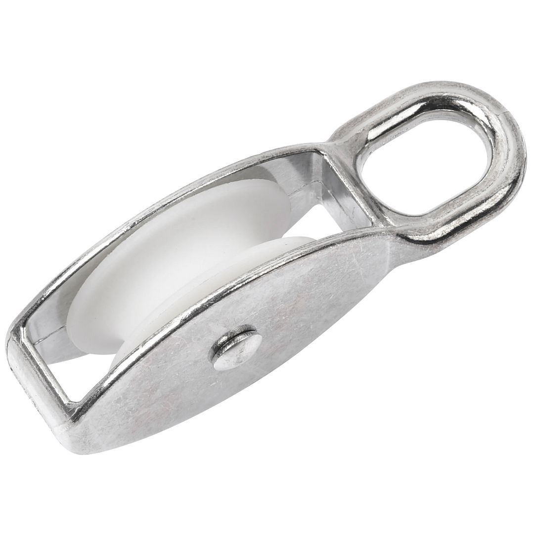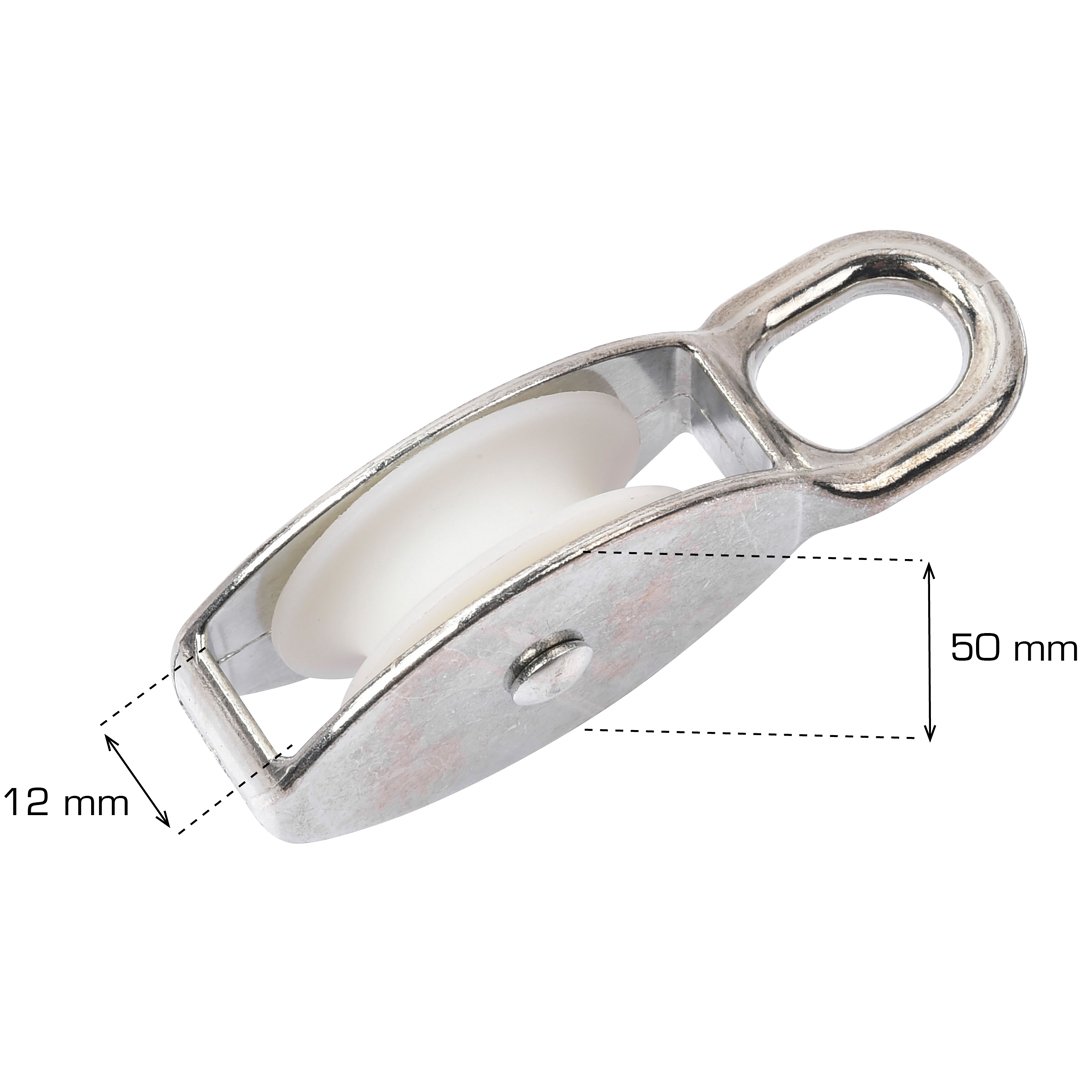 Elforsinket blokkrulle. Mål: Lengde 110 x Bredde 50 mm. Inntil ?12 mm. vaier 1 stk per pose.