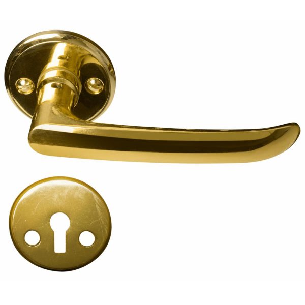 Dørhåndtak med ytterbehandling i messing til innerdører. Leveres med massive rosetter, nøkkelskilt og skruer til montering. Dørtykkelse: 30-45 mm. Dørvriderpinne: 8 x 8 x 120 mm.