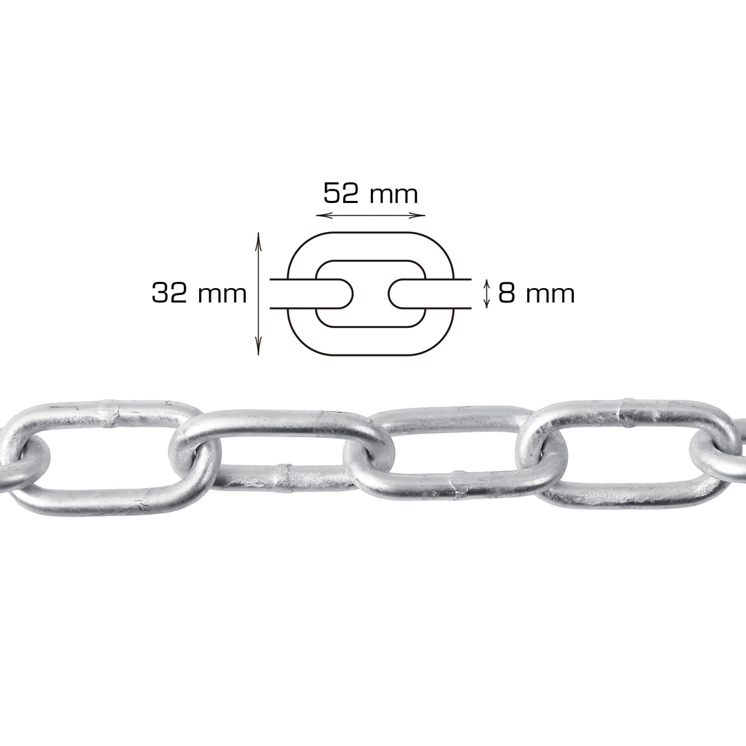 Galvanisert langleddet kjede 2 meter ћ 8 mm. DIN 5685-C Belastning: 2040 kg.