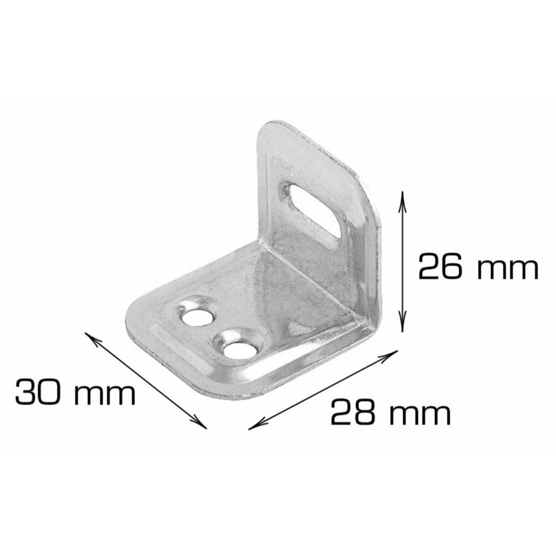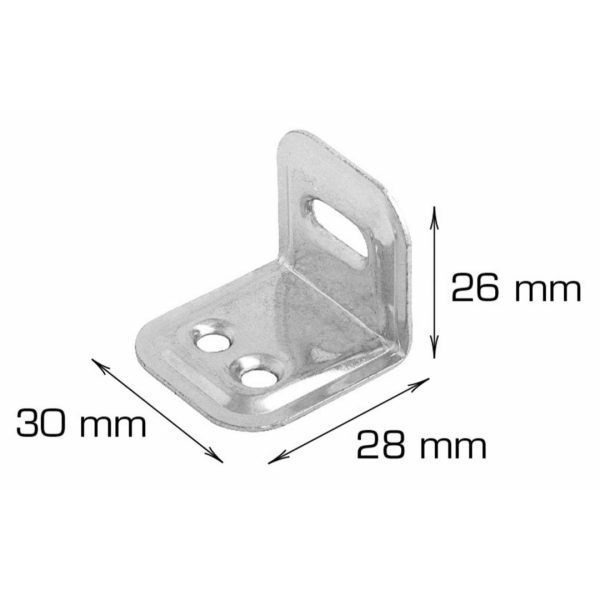 Mål: L28 x H26 x B30 mm. 4 stk. per pose inkludert skruer Materiale: Elforsinket.