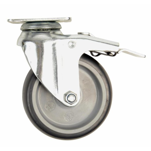 Med platefeste i stål og svart, dreibart gummihjul med brems.