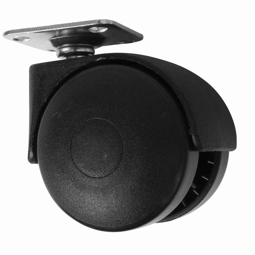 HomeIT svingbart måbelhjul. Svart plasthjul med hjul for platefeste. Hjuldiameter: 50 mm. Hjulbredde: 53 mm. Belastning: maks. 40 kg. Montering med platefeste.
