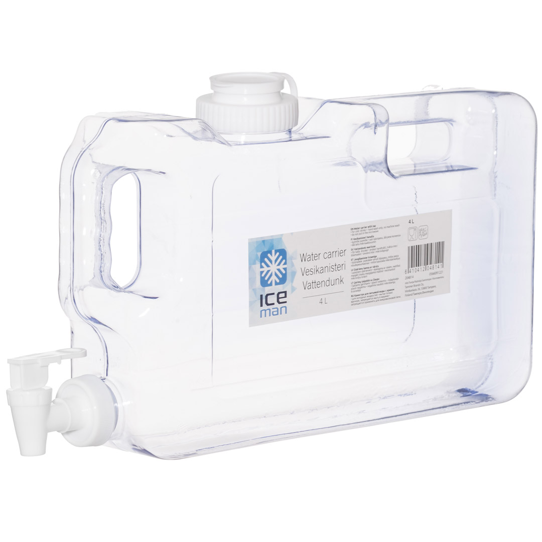 4 liters plastkanne med tappekran påfyllingslokk og to bærehåndtak.