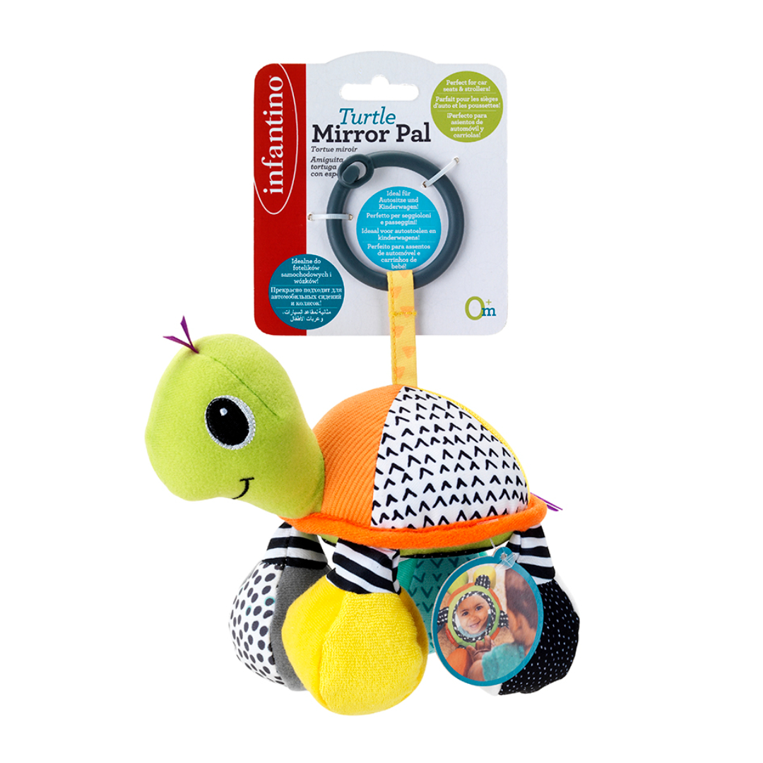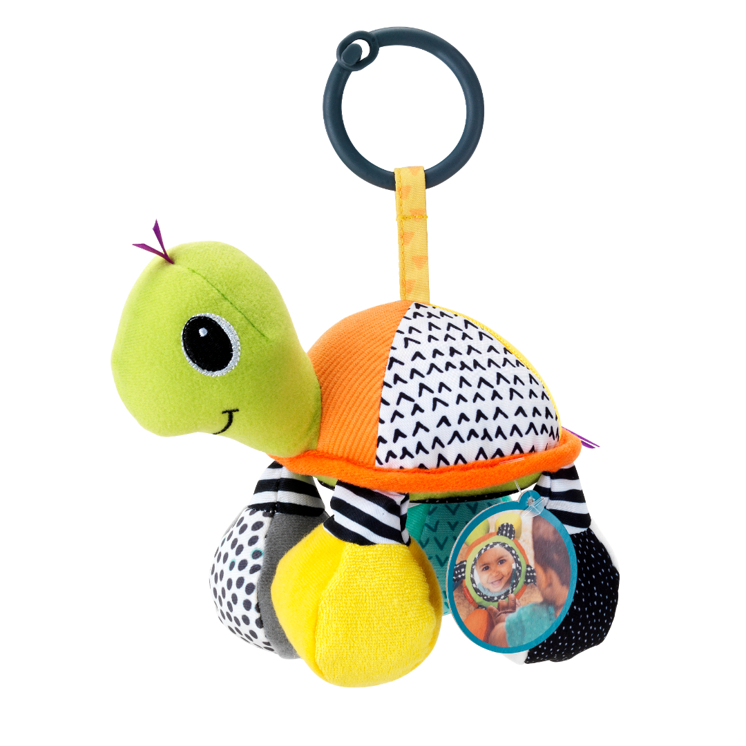 Denne morsomme skilpadderanglen er designet for å oppmuntre babyer til å nå, gripe og utforske. Med et speil på magen og en innbydende raslelyd blir dette en favoritt for de minste. Den kan festes til barnevogner, bilseter eller babygym for enkel lek på farten.