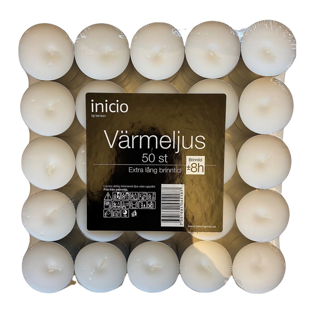 50 stk Inicio telys. 8 timers brenntid, inneholder ikke palmeolje.