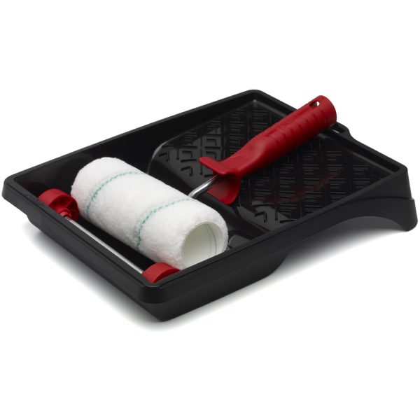 18 cm rullekar, bøyle og malerull. Rullen dekker godtяog spruter lite. Til tak, vegg og gulv.