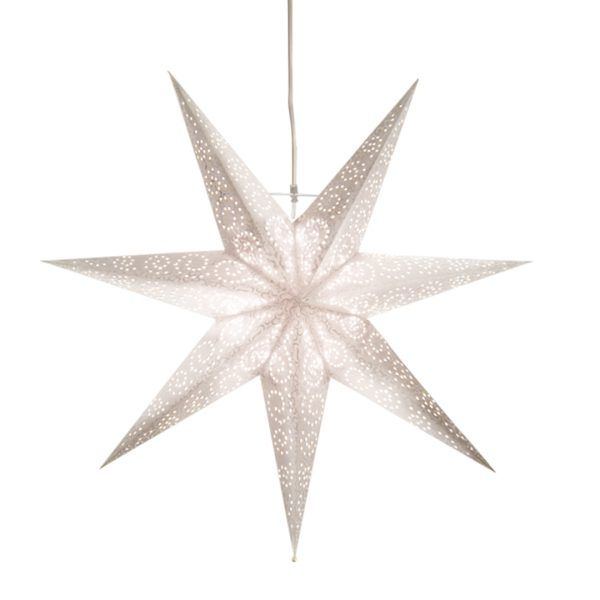 Dekorativ papirstjerne for innendørs bruk. Størrelse: 60 x 60 cm. Farge: Rød. Farge på ledning: Hvit. Lyspæresokkel: E14. Lengde på ledning:350 cm.