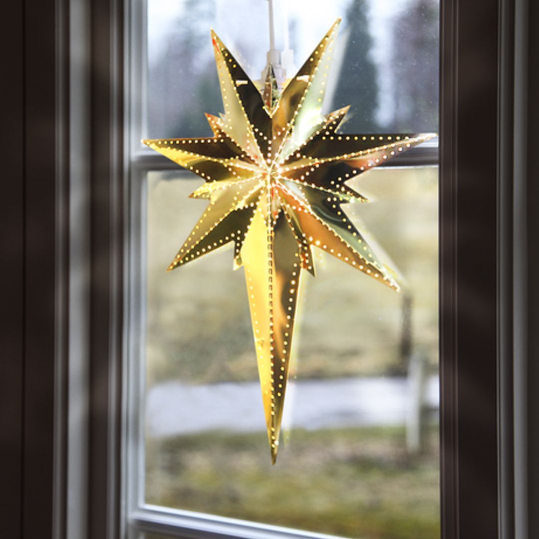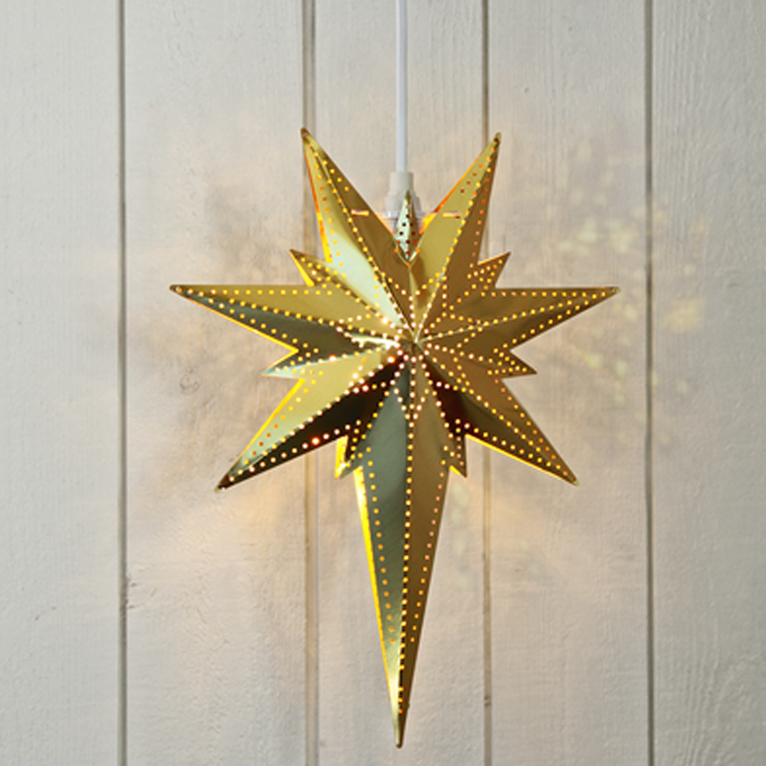 Vakker julestjerne i metall. Høyde: 35 cm. Bredde: 25 cm. Dybde: 7 cm. Spenning: 230 Volt, Sokkel på pære: E14. Maks effekt: 25 Watt. Ledningslengde: 350 cm. Innendørs bruk. IP klasse 20.