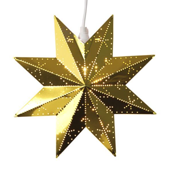 Klassisk julestjerne i messing farge. Høyde:28 cm. Bredde:28 cm. Dybde: 8 cm. Spenning: 230 Volt. Maks effekt: 25 Watt. Sokkel på pære: E14. Lengde på ledning: 350 cm. Innendørs bruk. IP klasse 20.