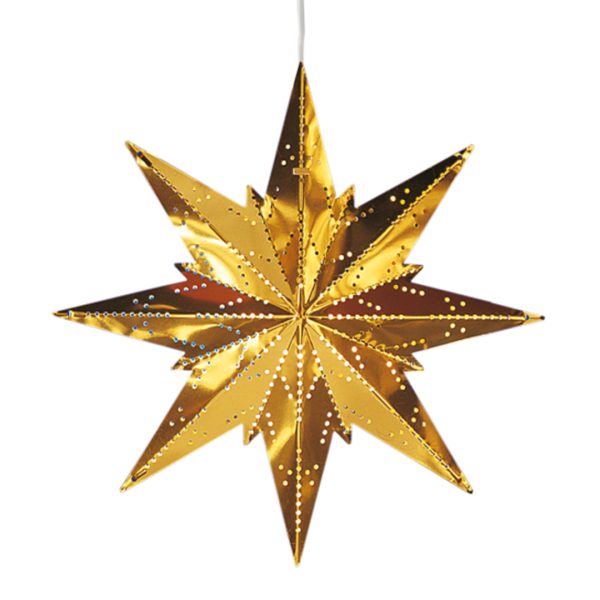 Julestjerne i messding farge. Høyde: 25 cm. Bredde: 25 cm. Dybde: 6 cm. Spenning: 230 Volt. Maks effekt: 25 Watt. Sokkel på pære: E14. Lengde på ledning: 350 cm. Innendørs bruk. IP klasse 20.