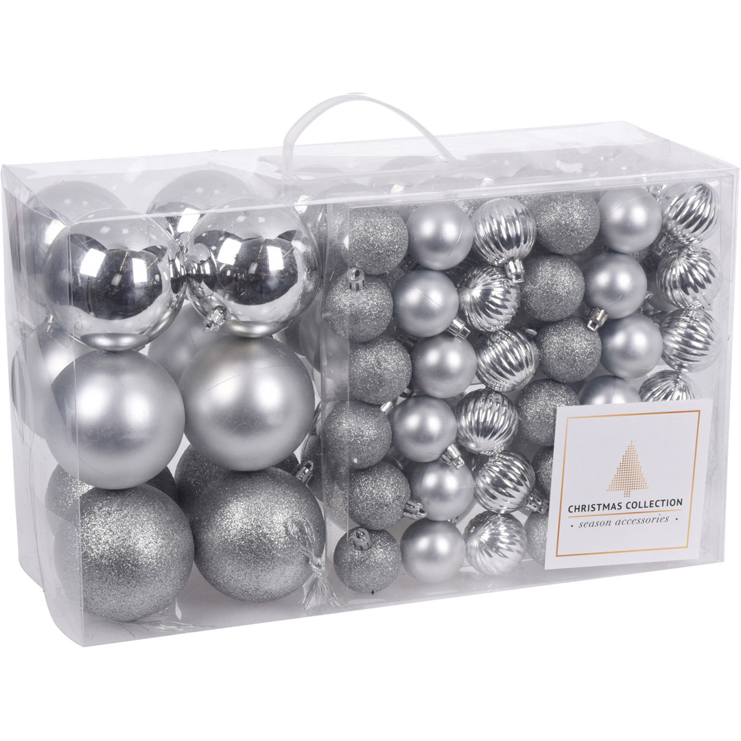 Juletrekuler 94 stk sølv tilfører et klassisk og stilig preg til juledekorasjonen. Settet består av kuler med matte, blanke og glitteroverflater for et variert uttrykk.