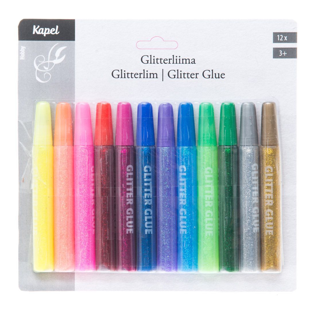 12 pakning med glitterlim som lyser opp tegninger, plakater og skoleprosjekter. 12 forskjellige farger.