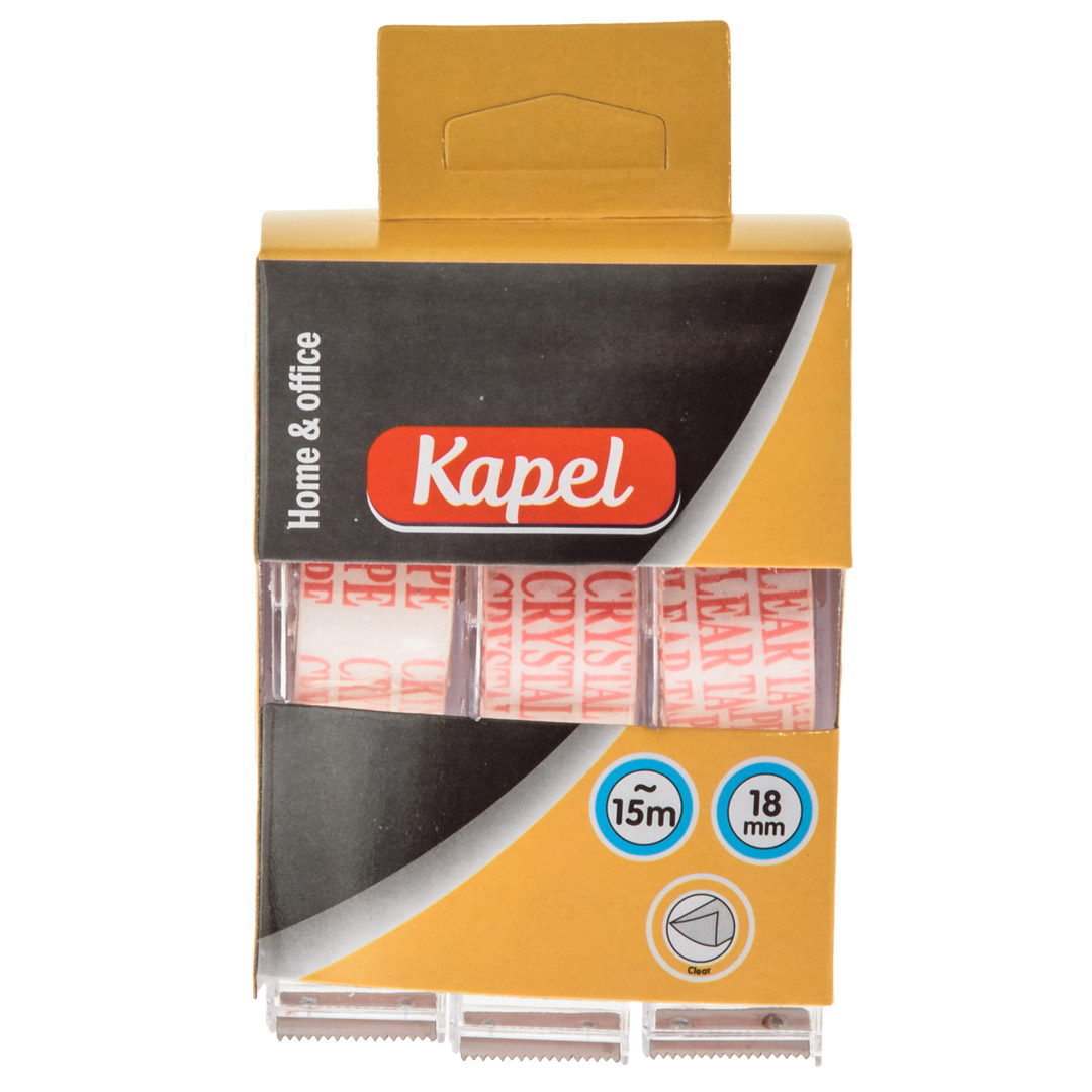 3 pakning taperull med dispenser og kniv. Dimensjon: 18 mm x 15 meter.
