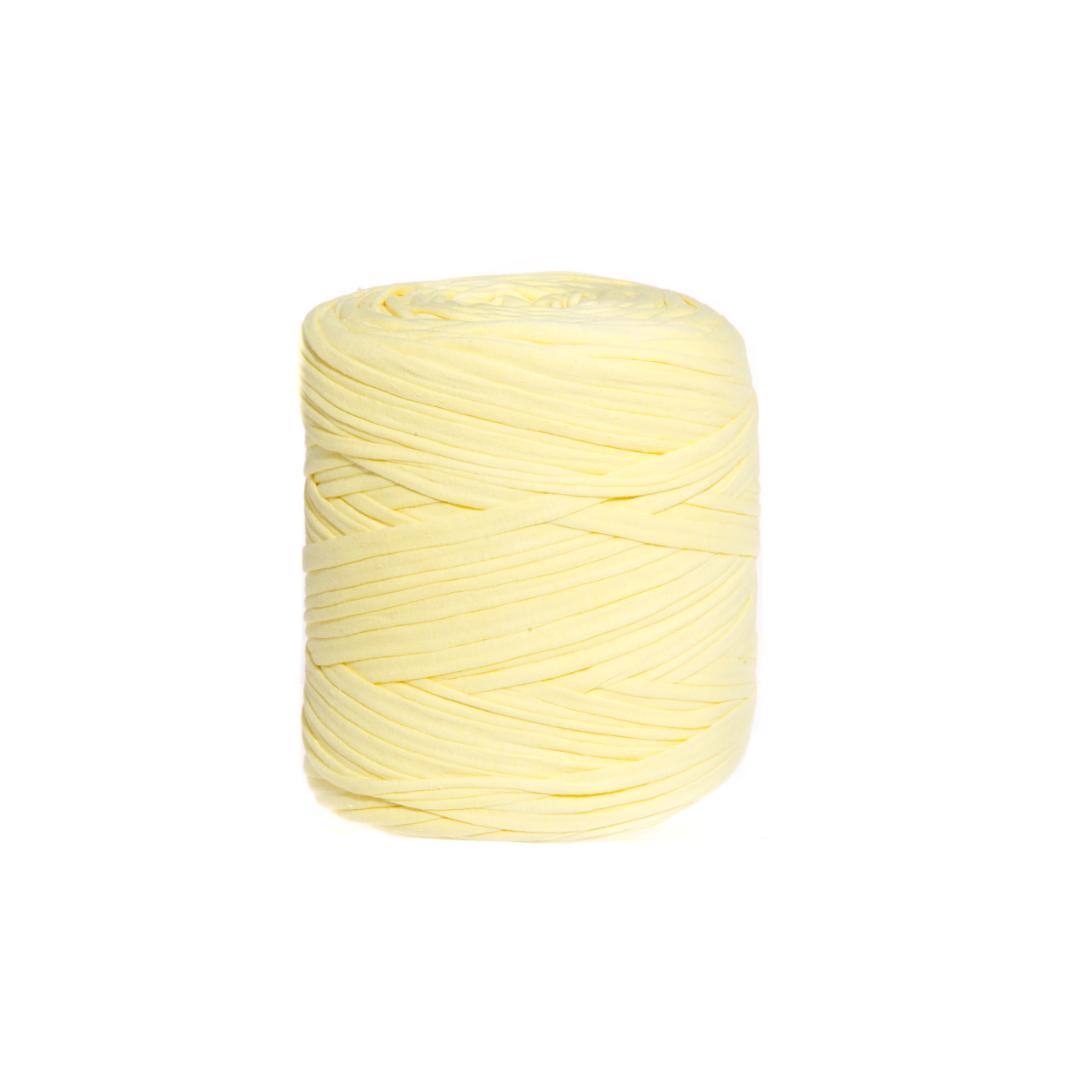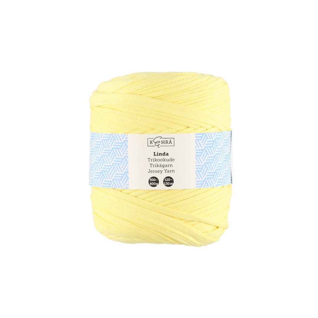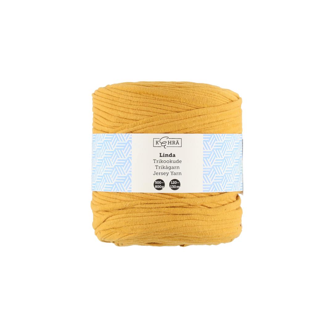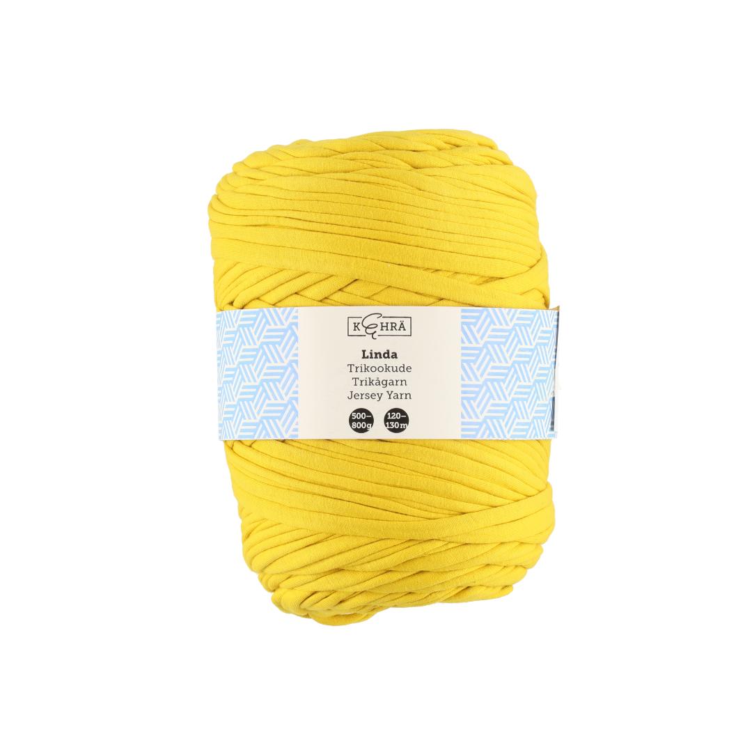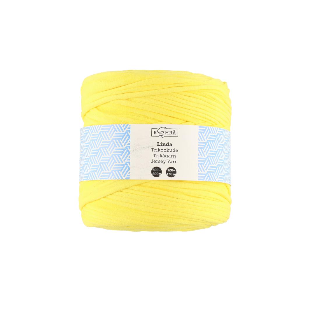 Oppdag Kehrä heklegarn i gul – et tykt, resirkulert t-skjortegarn som gir liv til dine heklete prosjekter med energi og farge.