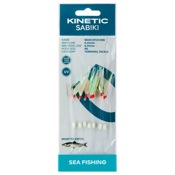 Kinetic MaxCatch sabiki hekla har syv kroker og evnen til å fylle fiskeboksen kjapt. Små og kraftige kroker med forlokkende kunstig fiskeskinn.