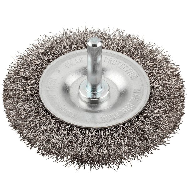 Hjulbørste, HSS ståltråd, korrugert, for rustfjerning, rengjøring, maling, kjelstein, avleiringer og kanter, til metall og stein, perfekt for arbeid på smale kanter, rammer, karmer, rister og rør.