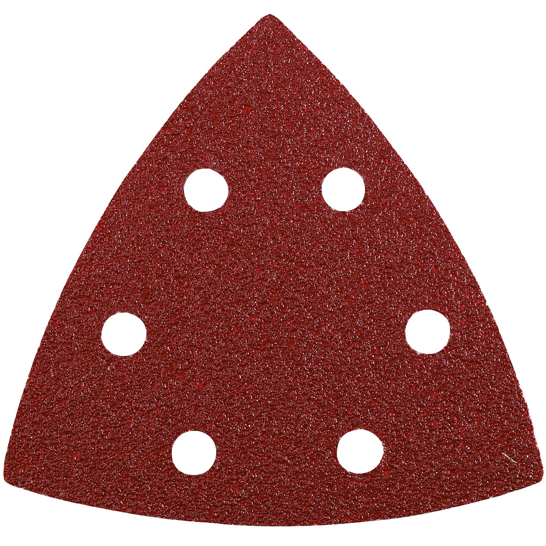 Slipepapir til trekantsliper, korning 180. 93 mm, til TRE OG METALL, med aluminiumoksidbelegg, fenolharpiksbundet, robust kjerne, tekstilbakside med borrelås, perforert, til bruk med trekant-/detaljslipere, til sliping av metall og tre, maling, lakk, sparkel, stein og plast. 5 stk pr pakke.