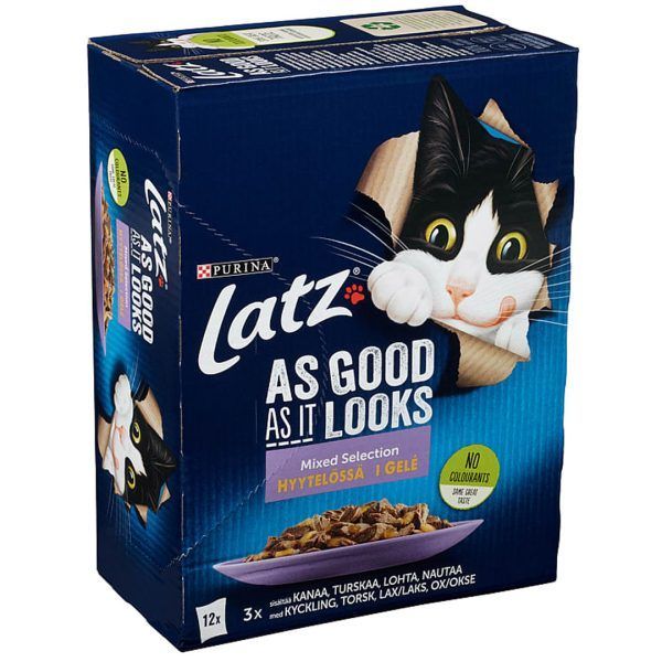 Pakke med 12 porsjonsposer som utgjør et komplett fôrsortiment for voksne katter. Latz As Good As It Looks er en serie med velsmakende måltider som er tilberedt med utrolig møre biter i en saftig gelé. Hvert måltid ser så lekkert ut. og lukter så godt at man skulle tro det var hjemmelaget. Hver oppskrift inneholder viktige Omega 6-fettsyrer. Riktig kombinasjon av balanserte mineraler og vitaminer som fyller kattens daglige næringsbehov når den mates i henhold til fôringsveiledningen på pakken.
