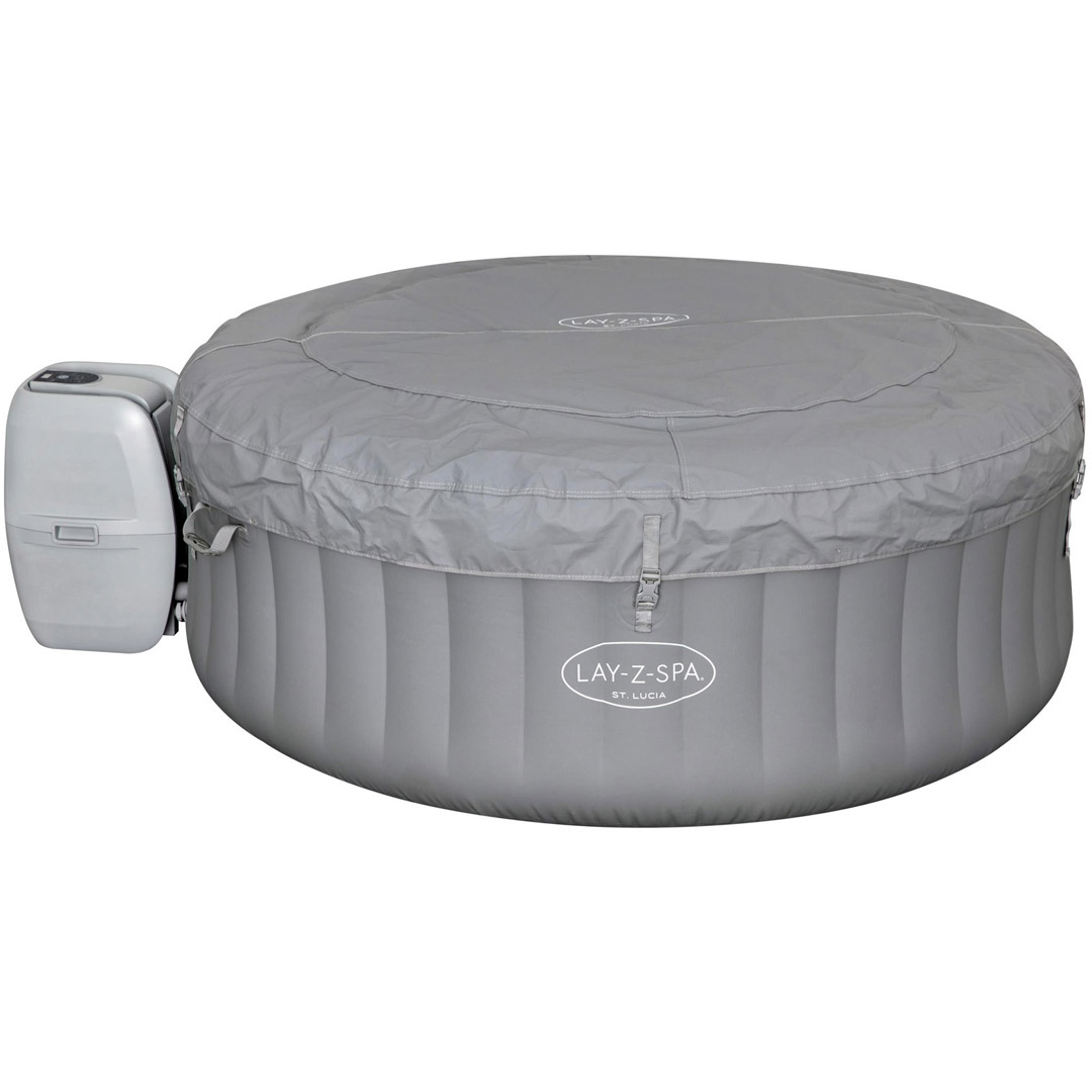 Lay-Z-Spa St. Lucia AirJet– Oppblåsbart helårsboblebad. Kompakt og rimelig modell beregnet for 2-3 personer. AirJet-massasjesystem med 110 luftdyser som gir en behagelig og avslappende massasje. Helårsmodell med FreezeShield-teknologi. Solid bassengkonstruksjon som gir god stabilitet og holdbarhet. Spapumpe med touchpanel og strømbesparende timerfunksjon. Enkelt vannvedlikehold med integrert og utskiftbar filterpatron og ChemConnect klordispenser. Bassengovertrekk med festeklips og innfelt luftpute som isolerer og reduserer varmetap. Karet bruker ekstern pumpeenhet slik at den enkelt kan frakobles og byttes om det skulle oppstå feil, uten verktøy, og uten å tømme badet for vann! Pumpeenheten består av sirkulasjonspumpe, massasjepumpe, varmeelement, computerpanel, jordfeilbryter og temperatursensor. Ingen elektronikk er integrert i selve badet. Alt levert i en eske: 86x60x46 cm.