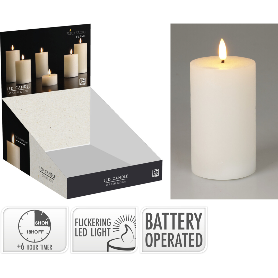 LED stearinlys 75 x 125 mm i hvit er et stilrent LED-lys med naturtro flamme og voksoverflate. Lyset gir et behagelig stemningslys uten åpen flamme, og passer godt både alene og sammen med lys i andre størrelser. Timerfunksjonen gir automatisk av- og påslag.