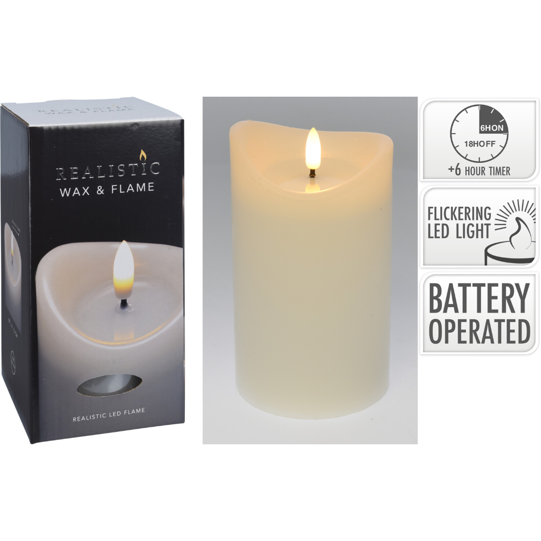 LED stearinlys 90 x 150 mm i hvit utførelse er et dekorativt lys med realistisk LED-flamme og glatt voksoverflate. Lyset gir et stemningsfullt uttrykk uten åpen flamme, og passer godt til både hverdag og sesongdekor. Den innebygde timerfunksjonen sørger for automatisk av- og påslag, noe som gjør bruken enkel og praktisk.