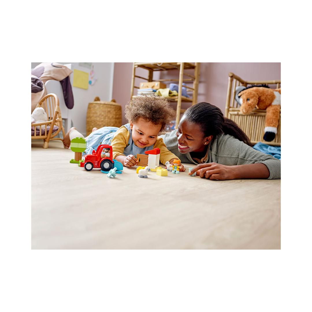 Voksne og barn kan dele magiske øyeblikk sammen og hjelpe til på gården og i barnedyrehagen. Inkluderer en traktor med en henger full av utstyr, to søte sauer og en bonde- og barnefigur. Barn utvikler finmotorikk og sosiale og emosjonelle ferdigheter når de frakter mat og mater sauene.