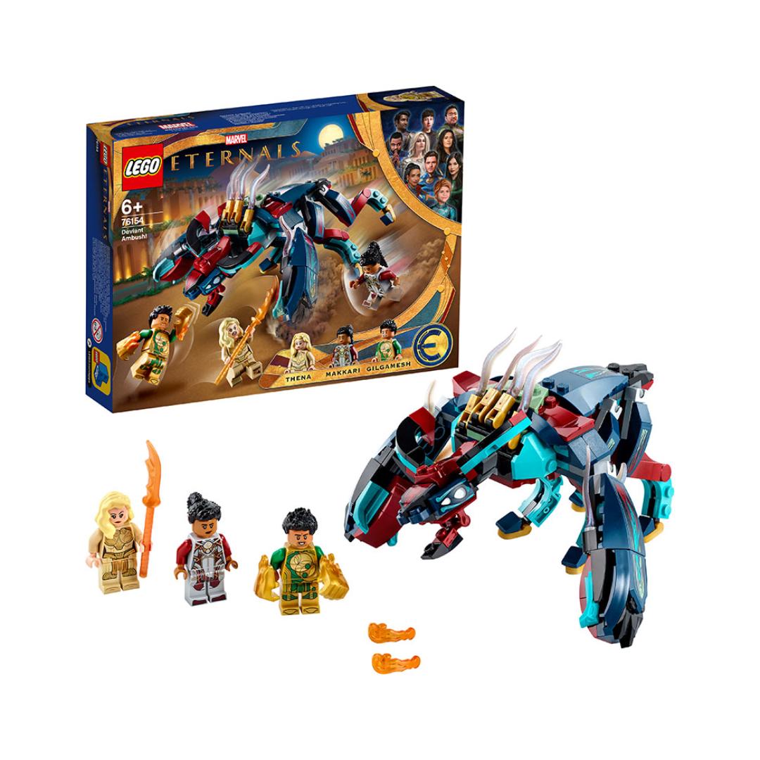 En seksbeint Deviant med glefsende kjever angriper tre The Eternals-superhelter – Thena, Gilgamesh og Makkari – og barn må mønstre alt de har av superkrefter for å hjelpe dem. Med de tre superhelt-minifigurene kan de rollespille at de bruker heltenes superkrefter: Thena kan mane fram nærkampvåpen, Gilgamesh er supersterk og Makkari kan bevege seg raskere enn lyden. Og om du ser etter en gave til en som liker minifigurer, er dette flotte LEGO lekesettet det eneste som inneholder en minifigur av Gilgamesh!